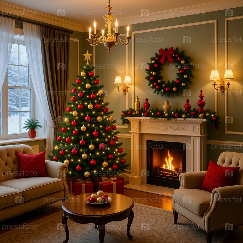 В гостиной есть рождественская елка, украшенная огнями и орнаментами.Подарки размещаются под деревом Generative AI