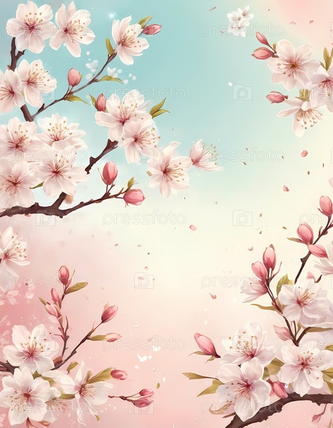 Листья танцуют по воздуху, а ветви вишневых цветов грациозно растягиваются, демонстрируя потрясающий массив мягких розовых цветков на фоне мечтательного пастельного неба во время спокойного весеннего дня Generative AI