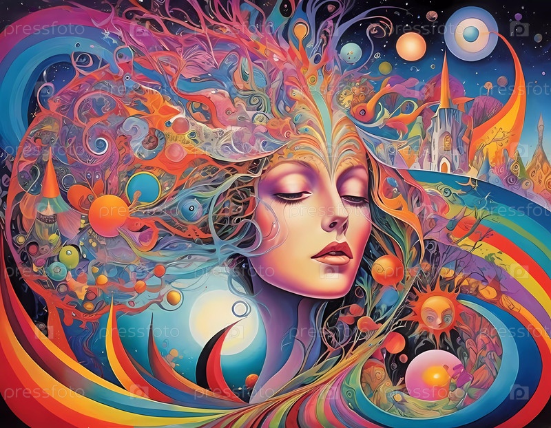 Завораживающее сочетание цветов изображает женскую фигуру с распускающимися волосами, окруженную космическими элементами. Психоделические красочные видения и галлюцинации. Малые элементы. Генеративный ИИ