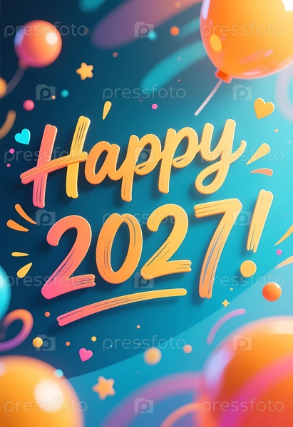 Яркий и красочный дизайн изображает слова "Счастливого 2021 года" с яркими воздушными шарами и игривыми формами на заднем плане
