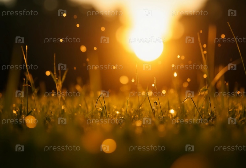 Утренний солнечный свет проливается на пышное зеленое поле, выделяя сверкающие капли росы на каждом листочке травы.Момент тишины захватывает красоту природы, которая пробуждается