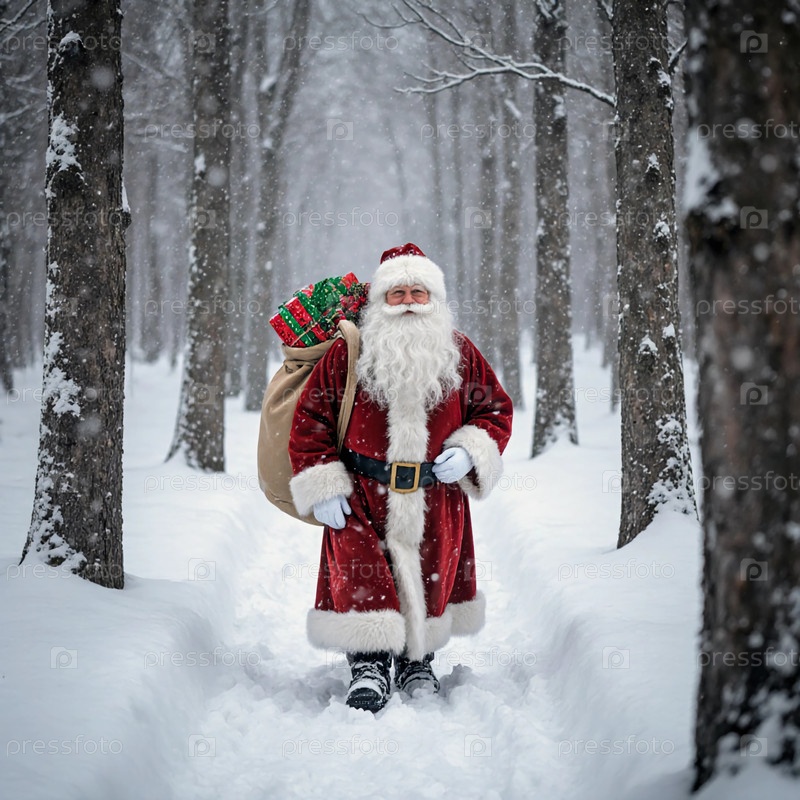 Санта-Клаус гуляет по заснеженному лесу. Он несет на спине мешок, полный подарков. Снег осторожно падает вокруг него, когда он пробирается сквозь деревья генеративная AI