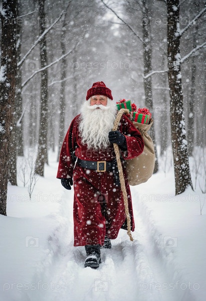 Санта-Клаус идет по заснеженной тропе в лесу. Он несет большой пакет, наполненный подарками. Снег медленно падает, когда он перемещается через деревья во время зимы Генеративная ИИ