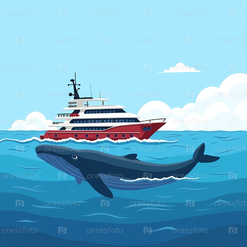 Грациозный кит плавает без усилий в чистых голубых водах, создавая мягкие волны.Поблизости потрясающая яхта спокойно плывет под ярким небом, гармонизируя с красотой природы