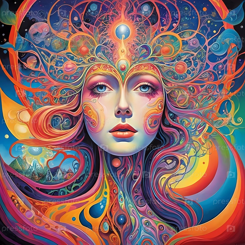 Завораживающее сочетание цветов изображает женскую фигуру с распускающимися волосами, окруженную космическими элементами. Психоделические красочные видения и галлюцинации. Малые элементы. Генеративный ИИ
