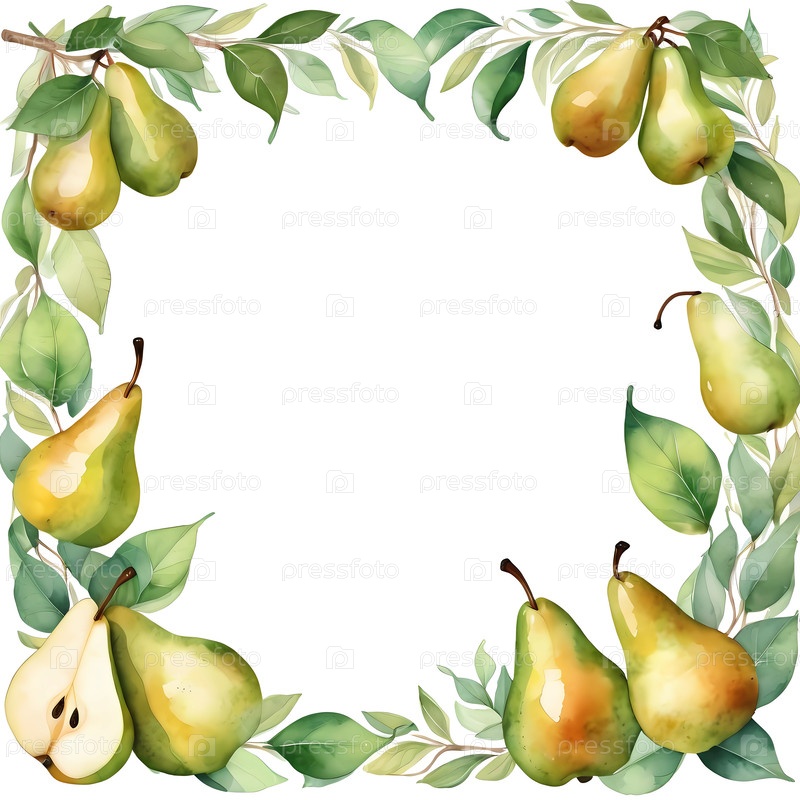 Красивый акварельный дизайн демонстрирует границу спелых груш и ярких зеленых листьев, создавая художественную раму, идеальную для приглашений, сообщений или макетов открыток