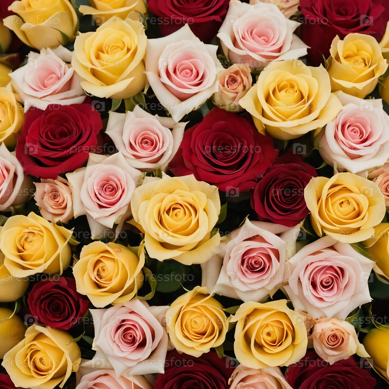 Потрясающий массив роз в оттенках красного, розового и желтого цветов заполняет рамку, создавая живое и очаровательное изображение, которое приносит радость и тепло любому случаю