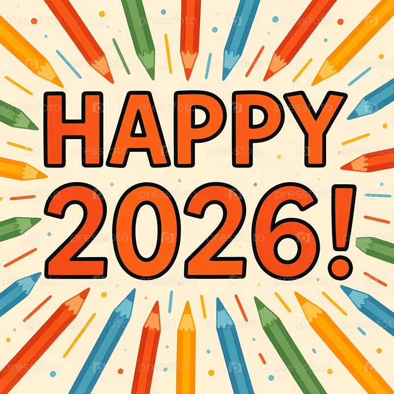 Сцена показывает веселый дизайн с красочными карандашами, излучающими вокруг большого текста, который гласит счастливый 2026