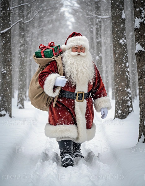 Санта-Клаус идет по заснеженной тропе в лесу. Он несет большой мешок, наполненный подарками. Снег медленно падает вокруг него, создавая сцену зимы Generative AI