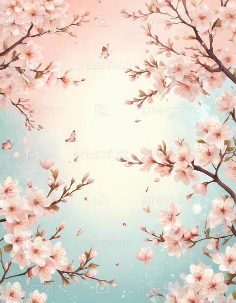 Деликатные вишневые цветки оформляют композицию, их мягкие лепестки дрожа в нежном ветре.Бабочки танцуют над спокойным фоном, празднуя приход весны