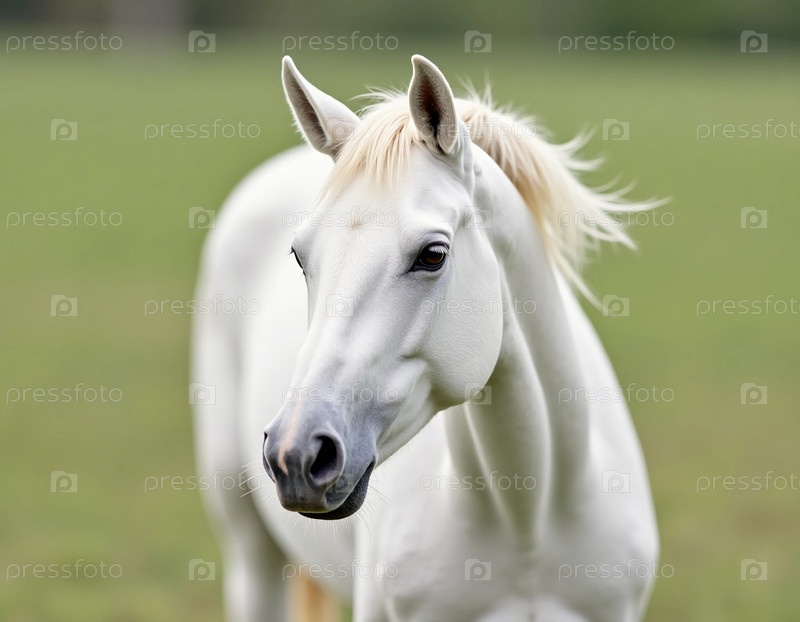 Мягкий солнечный свет целует элегантные черты белой лошади, стоящей гордо на живописном зеленом лугу