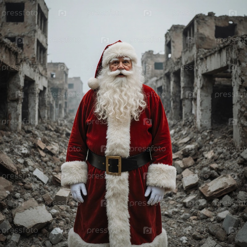 Санта-Клаус, несущий мешок с подарками, оказывается в зоне боевых действий. Он шокирован разрушениями и видом руин. Рождество и Новый год во время бомбардировок. Понятие войны и мира