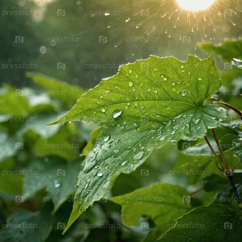 Листья с поцелуем росы ярко сияют в утреннем свете, освещенные солнцем, проникающим через листву после освежающего дождя, создавая спокойную атмосферу