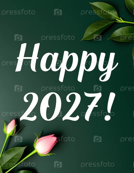 Розовые розы и зеленые листья окружают текст на темно-зеленом фоне, отмечая начало года Генеративный ИИ