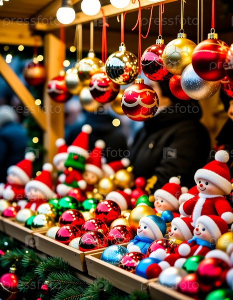 Семьи и друзья собираются на рождественскую ярмарку, чтобы посмотреть игрушки и украшения.Красочные декорации висят с киосков, добавляя радость к праздничной атмосфере Generative AI