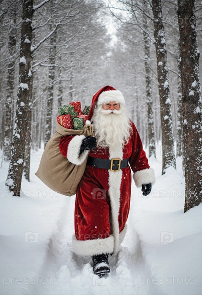 Санта-Клаус идет по заснеженной тропе в лесу. он несет большой мешок, наполненный упакованными подарками. снег покрывает деревья и землю вокруг него генеративная ИИ