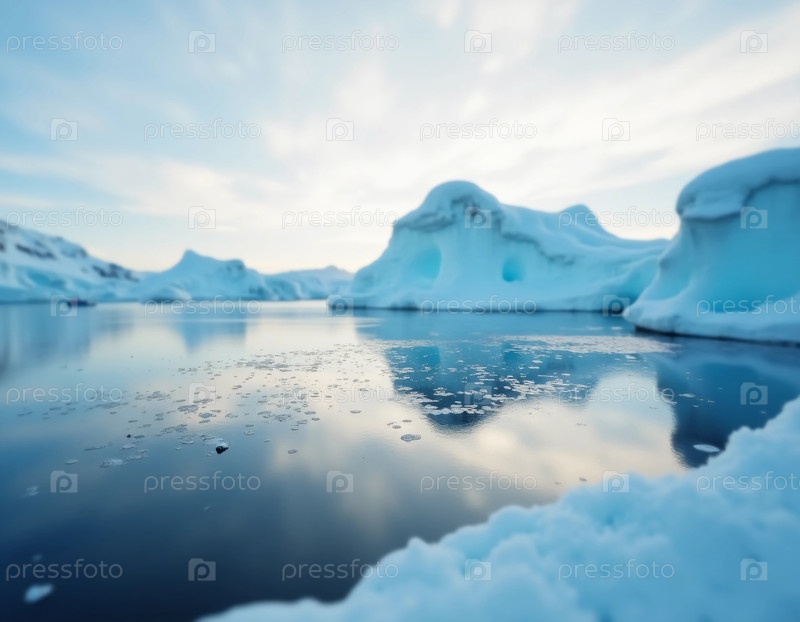 Потрясающий вид запечатлевает кристально чистую воду арктической бухты, усеянной ледниковыми айсбергами