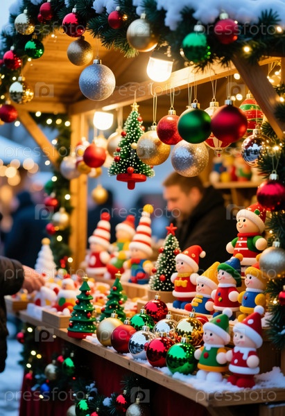 На рождественской ярмарке люди просматривают красочные игрушки и украшения, выставленные под яркими огнями.Маленькие деревья и праздничные орнаменты заполняют киоск, создавая оживленную сцену Generative AI