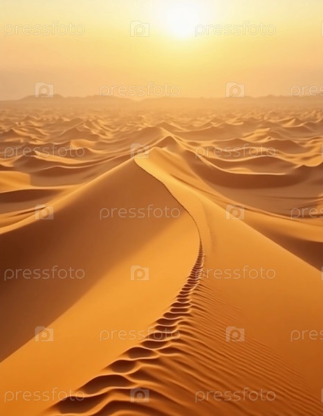 Мягкие золотистые оттенки окутывают обширную пустыню, где качающиеся песчаные дюны создают завораживающие узоры под сияющим закатом солнца