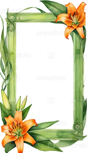 Яркие оранжевые лилии и пышные зеленые листья создают потрясающую акварельную раму, предлагая элегантный фон для персонализированных сообщений на дни рождения, юбилеи или праздники