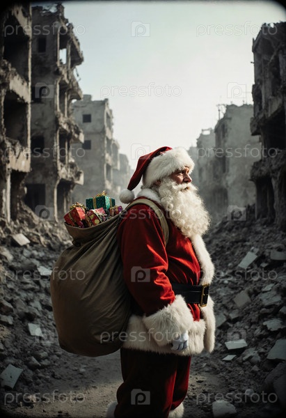 Санта-Клаус стоит в районе, разрушенном войной, с сумкой подарков на спине.Он приносит радость и надежду среди руин и разбитых зданий Generative AI