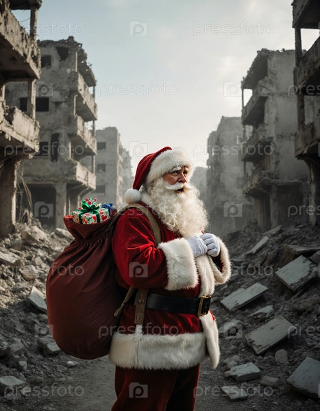 Санта-Клаус стоит среди разрушенных зданий в городе, пострадавшем от войны. он несет большой пакет с подарками. окружающая среда показывает признаки уничтожения, подчеркивая контраст генеративный ИИ