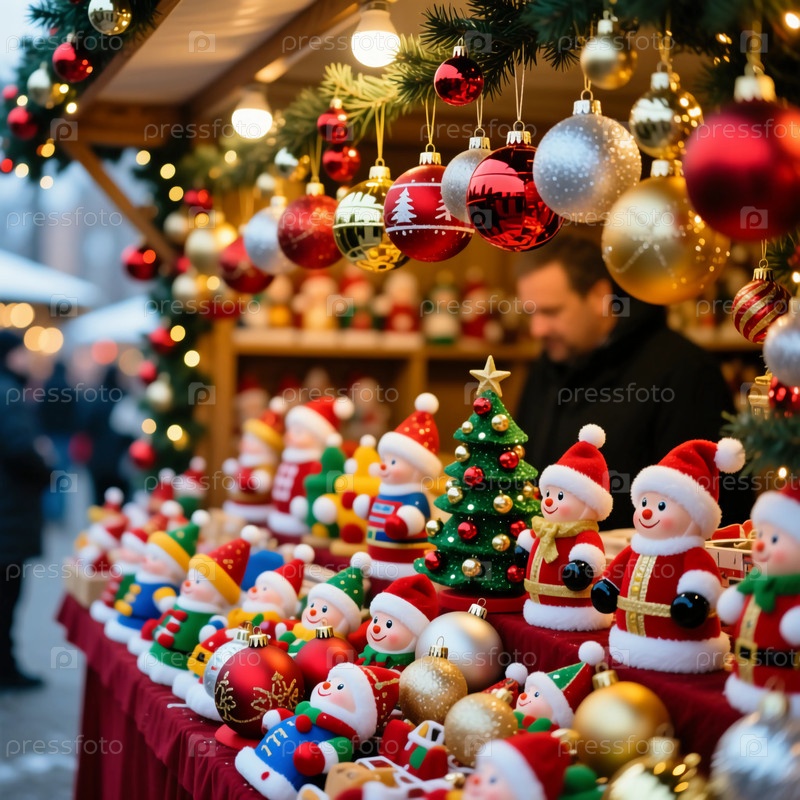 Посетители осматривают рождественскую ярмарку, наполненную красочными игрушками и украшениями