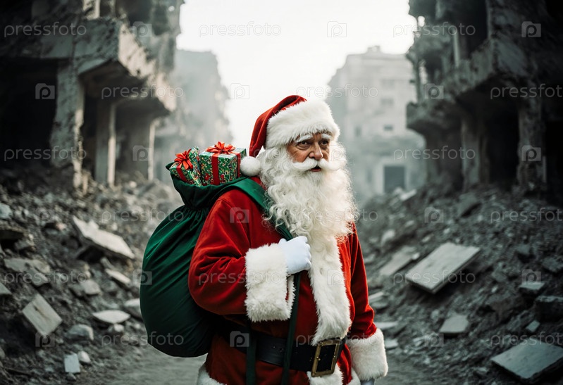 Санта-Клаус гуляет по разрушенному району, неся большую зеленую сумку, наполненную подарками.Сцена показывает контраст между грустью и праздничным духом в тяжелые времена Generative AI