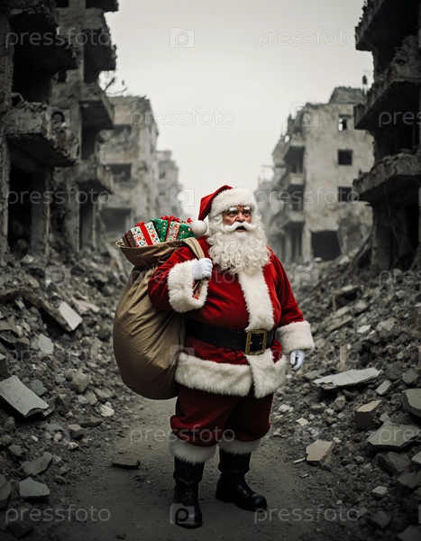 В разрушенном войной городе Санта-Клаус стоит среди руин. Он несет большой мешок, наполненный подарками. Сцена показывает контраст между духом праздника и уничтожением вокруг него