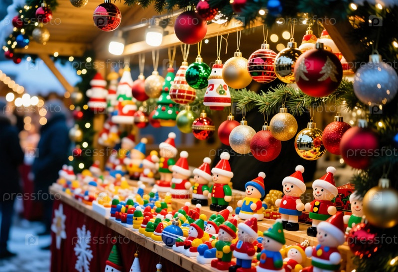 Посетите оживленную рождественскую ярмарку, наполненную игрушками и украшениями.Красовые фигуры и орнаменты висят с стендов, когда люди наслаждаются праздничной атмосферой Генеративный ИИ
