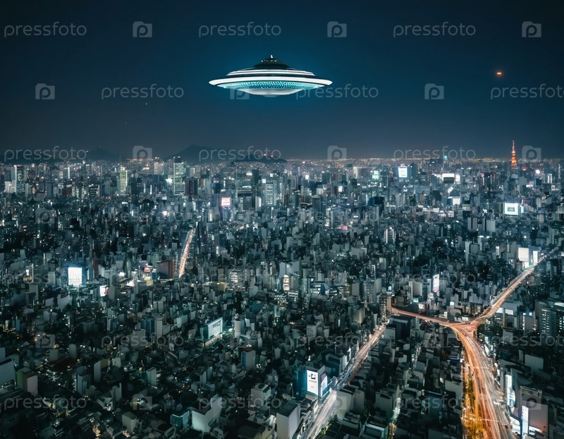 Потрясающий вид на разветвленный мегаполис под звездным небом нарушается плавающим инопланетным космическим кораблем.Живые огни города светится снизу, создавая сюрреалистическую атмосферу Generative AI