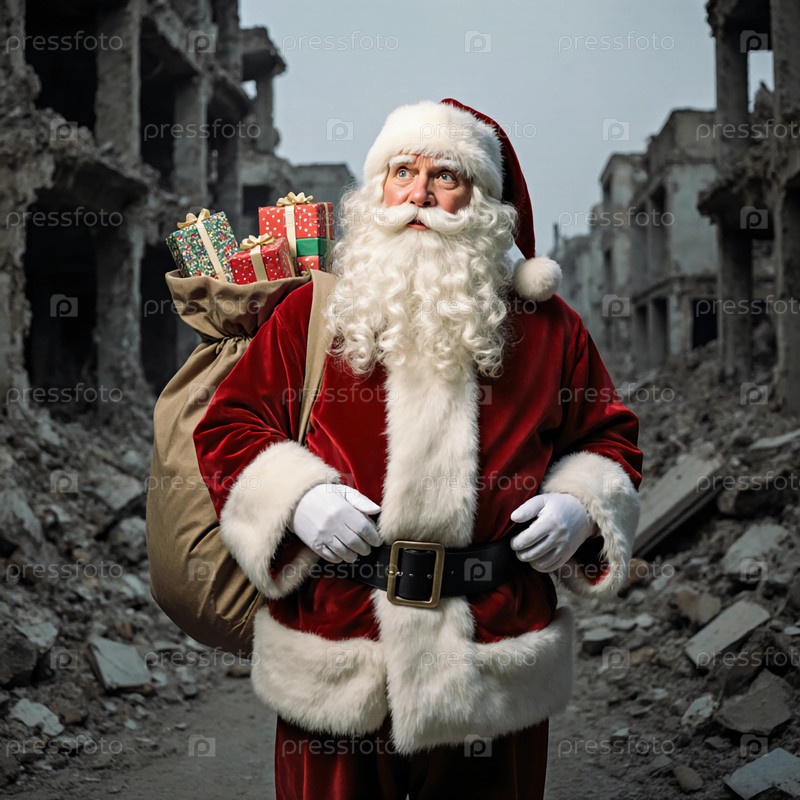 Санта-Клаус стоит в разрушенном городе с руинами вокруг него. он держит большой пакет, полный подарков. настройка показывает остатки войны и отчаяния генеративная ИИ