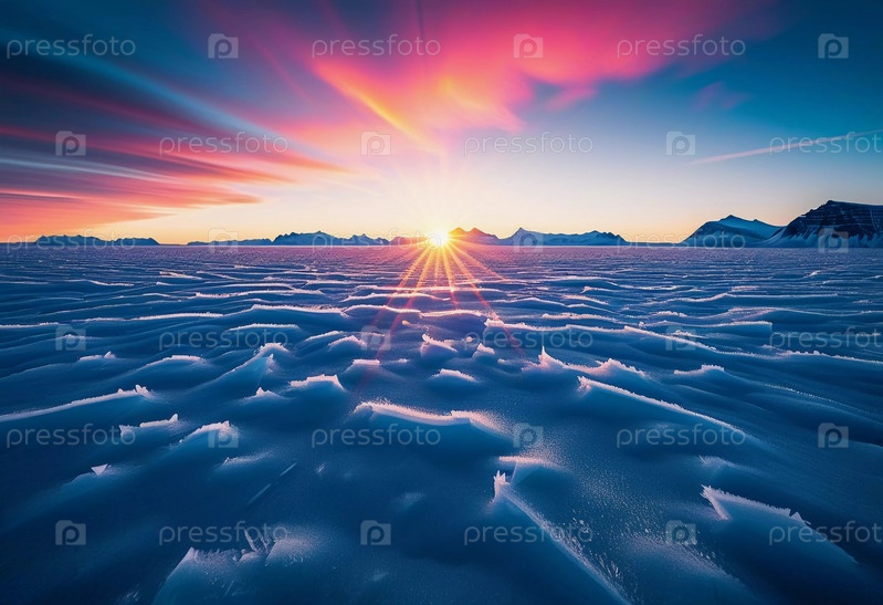 Спокойный арктический ландшафт тундры покрыт морозом при восходе солнца, излучая золотистый свет над ледяной местностью и освещая тонкие образования льда