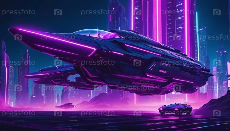 Футуристические космические корабли навигируют по завораживающей вселенной, наполненной неоновыми оттенками, демонстрируя передовые технологии на фоне сияющих городских пейзажей