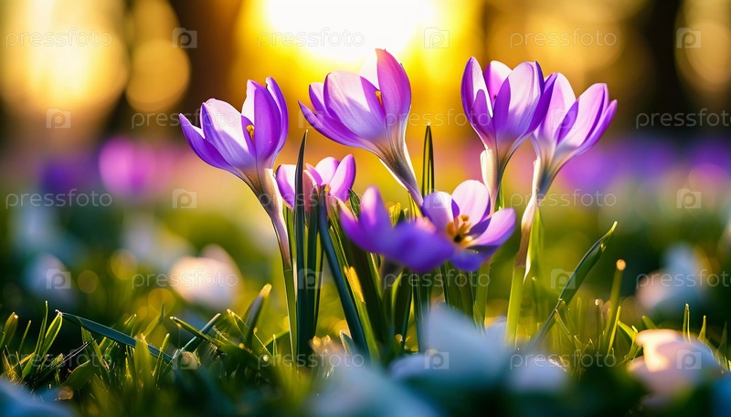 Нежные розовые цветы крокуса расцветают в пышной зеленой траве, солнечный свет в тихой весенней обстановке. Возрождение природы. Шафран Крокус - род многолетних луковичных травных растений семейства Ирис Iridaceae