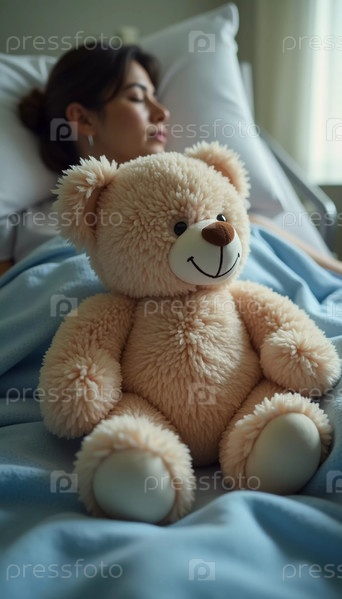 В тихой больничной комнате нежный плюшевый медведь сидит рядом с уставшей женщиной, восстанавливающейся после болезни, символизируя надежду и утешение среди ее борьбы