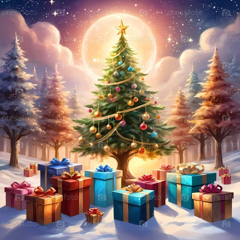 Декорированная рождественская елка, украшенная красочными орнаментами и наложенными подарками, готова к празднованию в уютной праздничной обстановке. упакованные подарки различных цветов. праздничная атмосфера, теплота и радость. AI