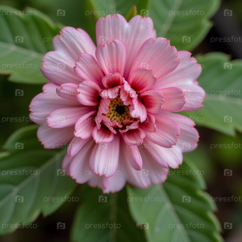 Потрясающий розовый цветок раскрывает свои сложно сложенные лепестки, демонстрирующие тонкие оттенки и узоры на фоне зеленого листья