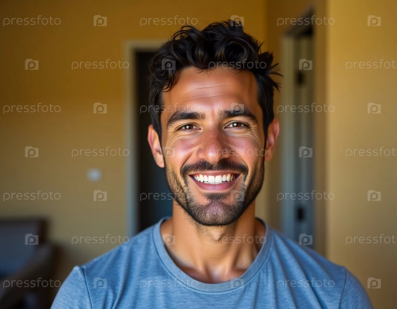 В обычной серой рубашке веселый бразилец демонстрирует сияющую улыбку, яркая атмосфера подчеркивает его дружественное поведение и создает гостеприимную атмосферу