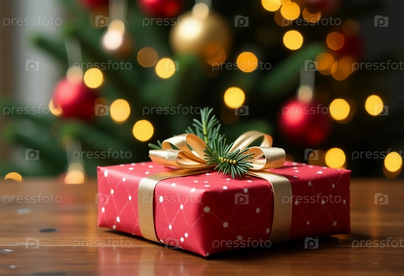 Очаровательный подарок сидит на деревянном столе, украшенный блестящим луком и веточкой зелени, в то время как мерцающая рождественская елка создает теплую, приглашающую атмосферу празднования