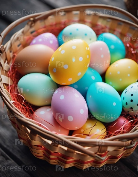 Пасхальные яйца различных цветов отдыхают в корзине, создавая праздничную атмосферу.Устроенные для весеннего торжества на открытом воздухе, яйца добавляют цвет и радость, символизируя обновление и единство во время праздника