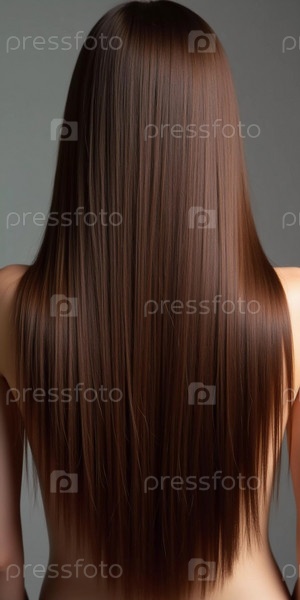 Гладкие, прямые коричневые волосы элегантно протекают вниз по спине, подчеркивая его здоровый блеск и равномерный цвет, освещенные мягким освещением, создавая поразительный вид
