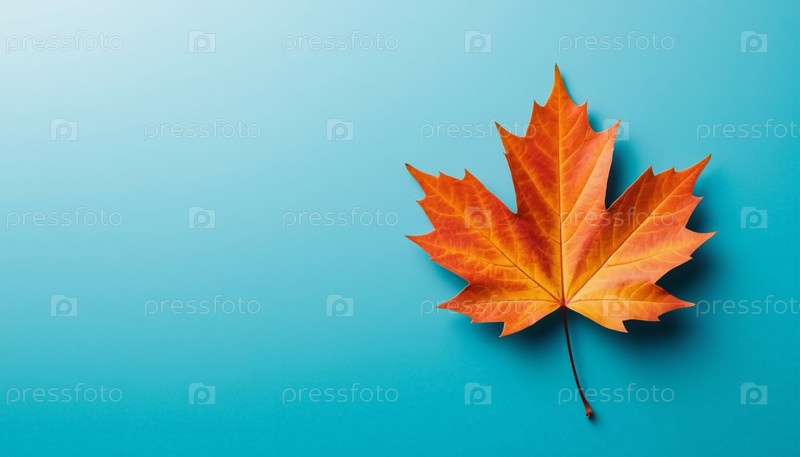 Желтый осенний лист на синем фоне смелый контраст между теплым и прохладным. минималистическая фотография природы сверху вниз для осени