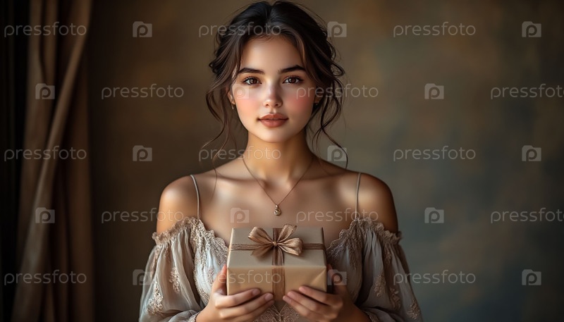 Красивая молодая женщина держит коробку с подарками, улыбается, изолирована на белом фоне