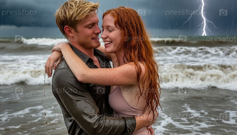 Влюбленная пара, блондин и рыжеволосая девушка обнимаются на берегу моря во время шторма