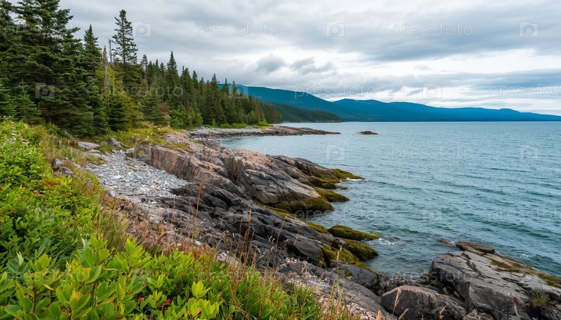 Морской пейзаж с скалистым берегом и сосновым лесом