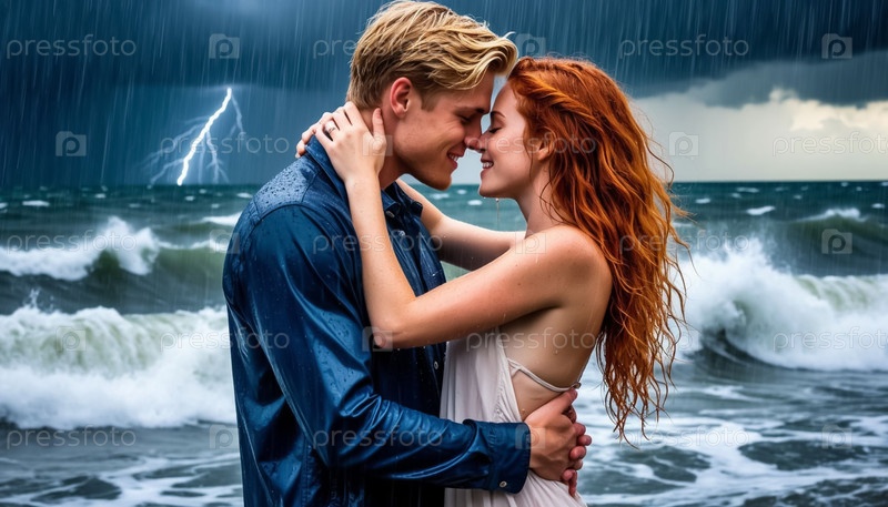 Влюбленная пара, блондин и рыжеволосая девушка обнимаются на берегу моря во время шторма