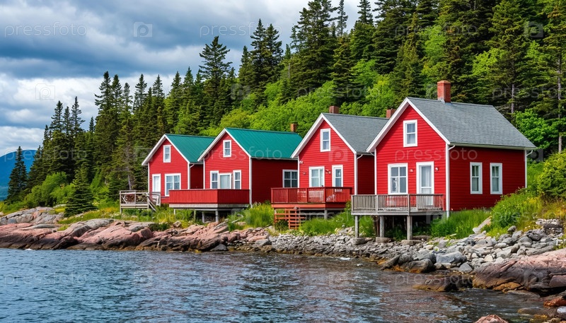 Красные коттеджи на берегу озера с скалистым берегом и сосновым лесом