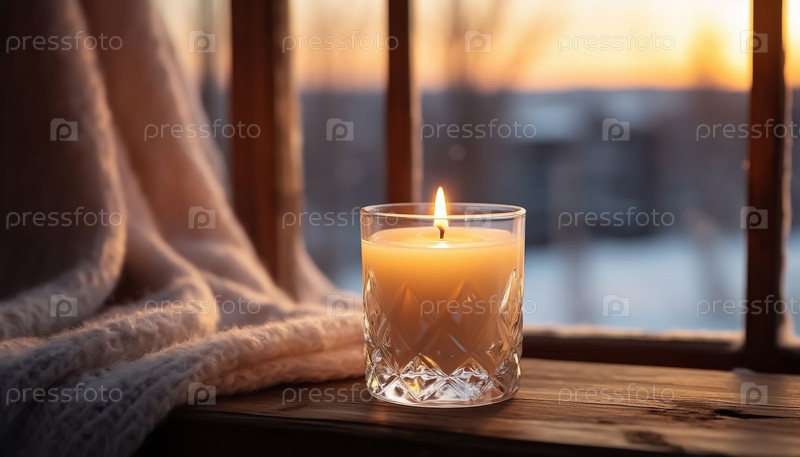 Сцена зимнего окна с горящим стеклянным держателем свечей
