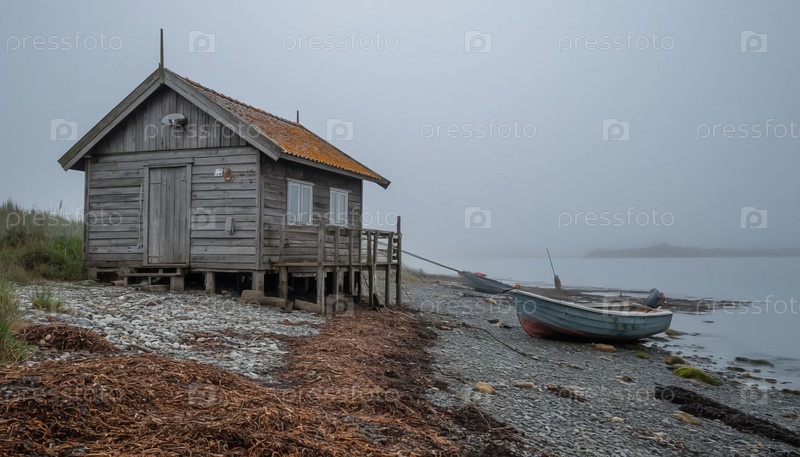 Старый рыбацкий домик на берегу водоема